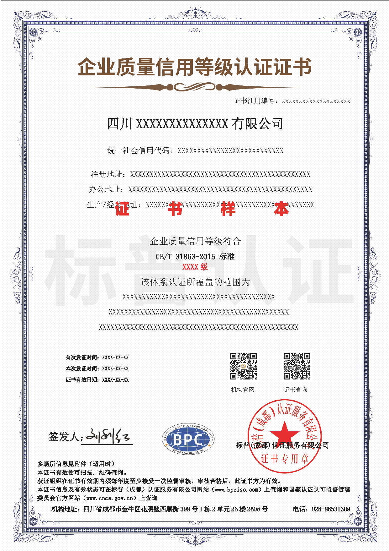 企业质量信用等级认证证书是由第三方权威机构对企业在质量管控、诚信经营、履约能力等方面进行综合评估后颁发的资质证明,旨在客观反映企业的质量信用水平,为市场合作、政府监管、消费者选择提供参考依据。该认证通常基于国家相关标准(如 GB/T 31863《企业质量信用评价指标》),结合行业特点构建评价体系,是企业软实力的重要体现。